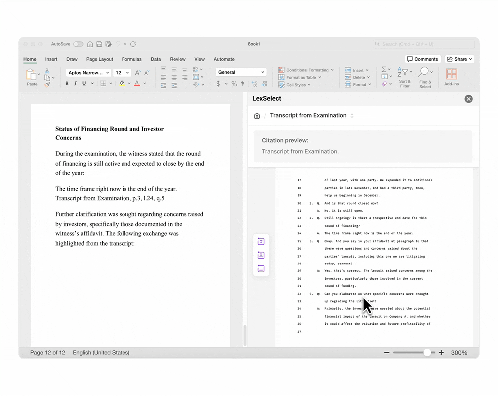 Whether you're reviewing discovery packages, analyzing client policies, or drafting briefs, LexSelect lets you search across PDFs, jump to the exact source passage, and drop citation‑ready excerpts directly into Word.